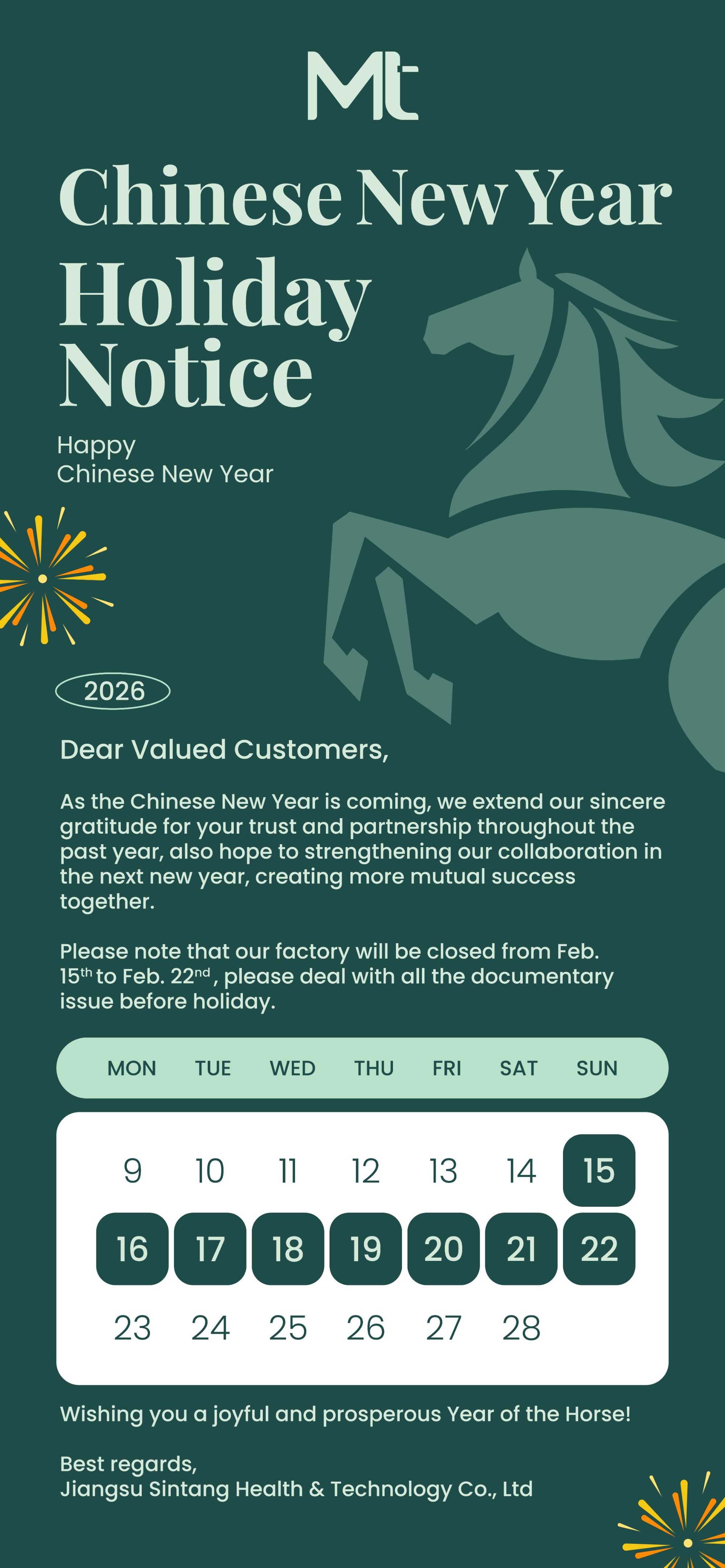 Jiangsu Sintang is officially back to work today, please feel free to place new order ASAP to supplement the inventory because the production schedule is already full in March!